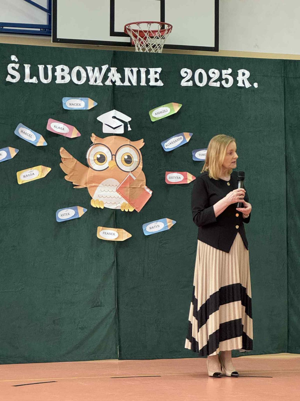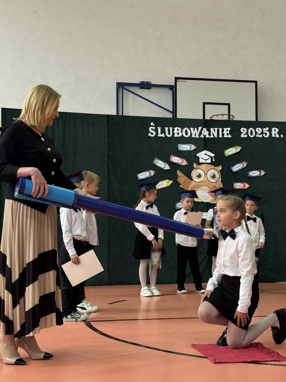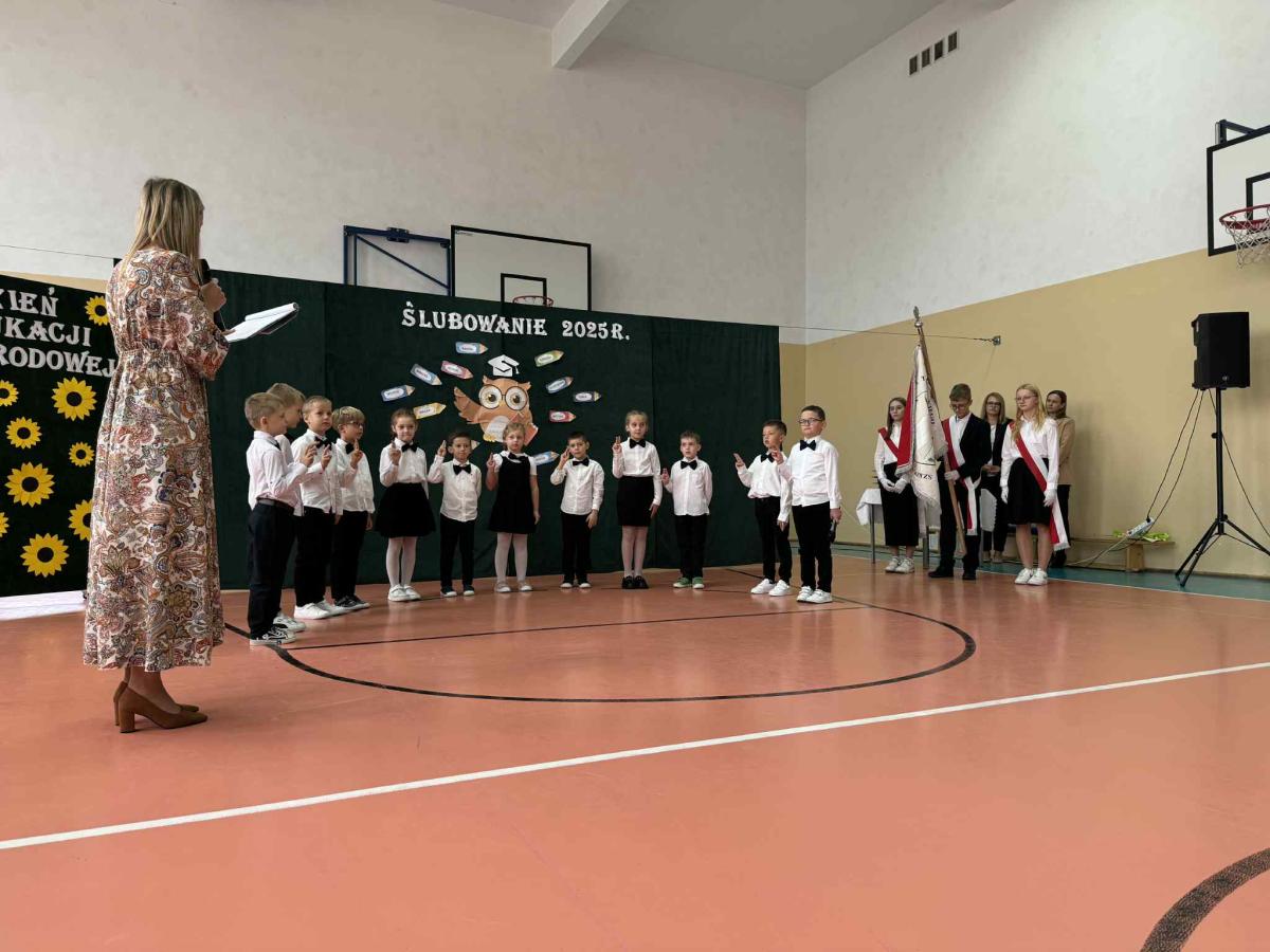 Podczas uroczystości uczniowie klasy pierwszej zostali przyjęci do grona uczniów. W trakcie akademii zaprezentowali swoje umiejętności, wyrecytowali wiersze i zaśpiewali piosenki. Przed pocztem sztandarowym ślubowali być dobrymi Polakami, godnie reprezentować swoją szkołę, swym zachowaniem i nauką sprawiać radość rodzicom i nauczycielom. Po złożeniu ślubowania pani dyrektor dokonała symbolicznego pasowania na ucznia. Po akademii dzieci udały się na „słodki” poczęstunek, przygotowany przez rodziców, którym serdecznie dziękujemy.