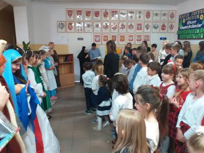 Przy okazji uroczystości wręczone zostały uczniom nagrody, którzy uczestniczyli w Konkursie kolęd oraz Konkursie na stroiki bożonarodzeniowe. Na koniec Pani Dyrektor złożyła wszystkim życzenia świąteczne.