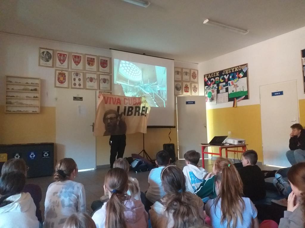 Drukuj Powrót do poprzedniej strony Spotkanie z podróżnikiem 13.10.2025 15:17 Treść Jak co roku naszą szkołę odwiedził podróżnik z grupy "Trzask". Tym razem przybliżył naszym uczniom życie i zwyczaje mieszkańców południowoamerykańskiej Kuby.