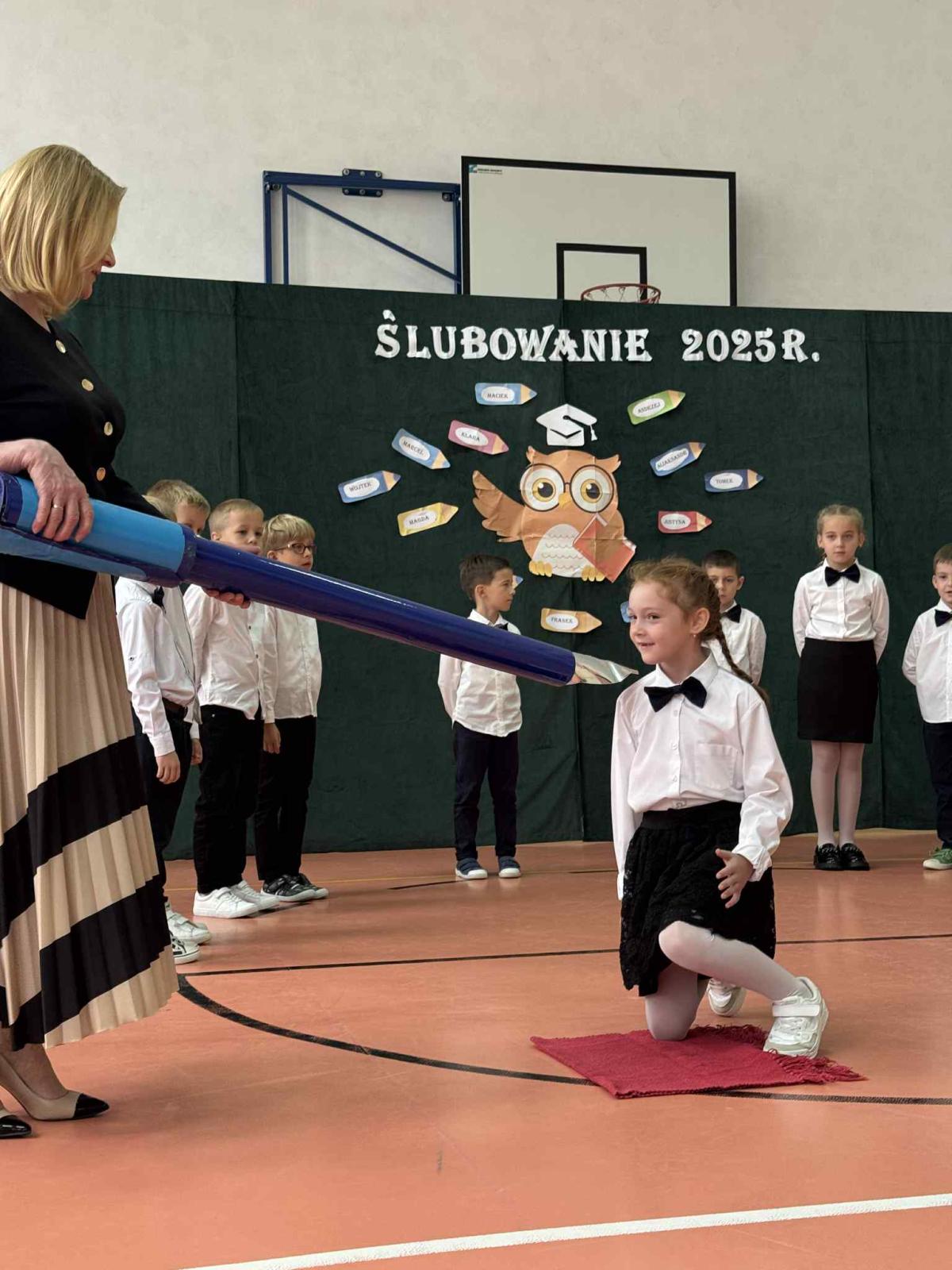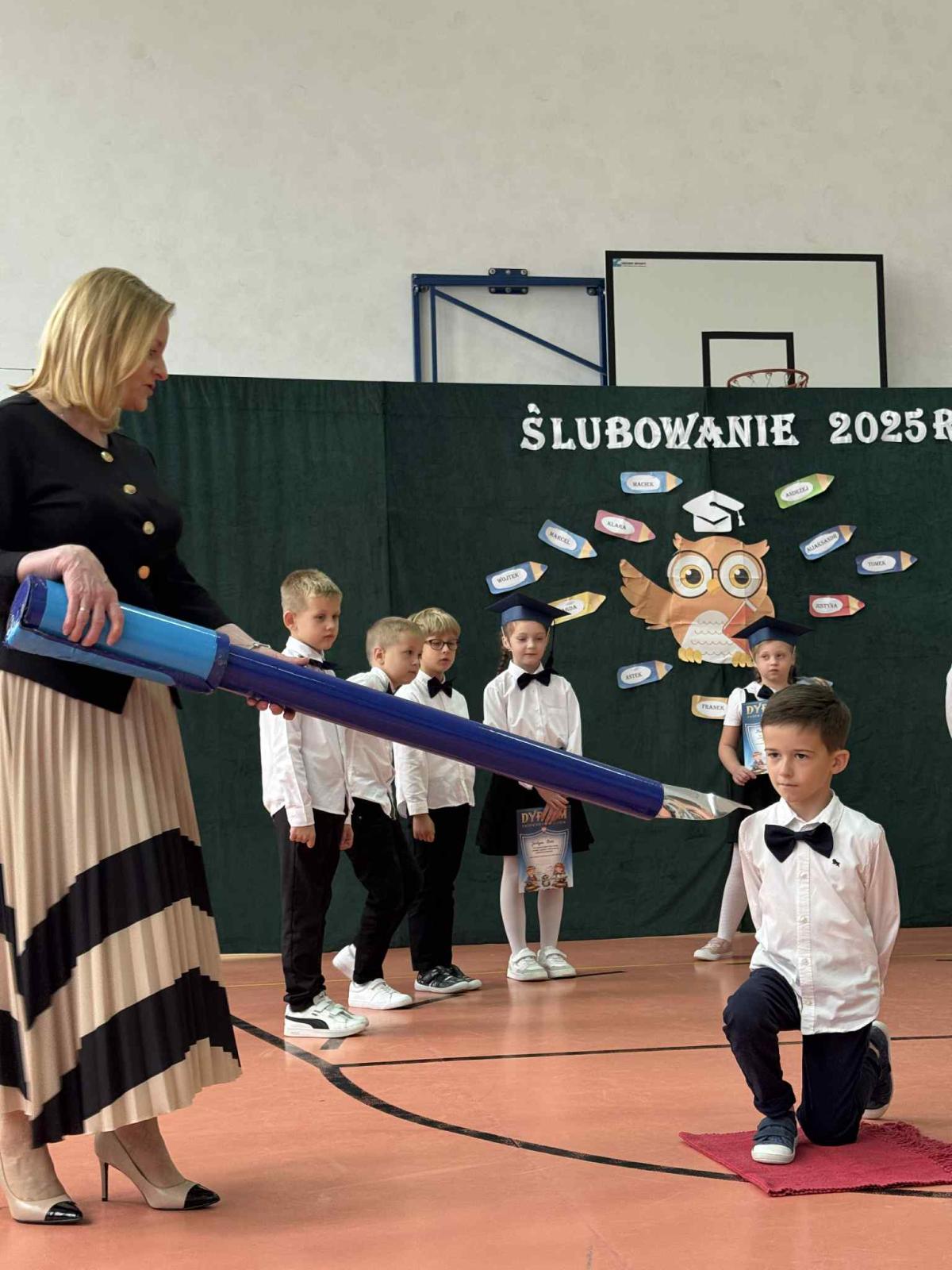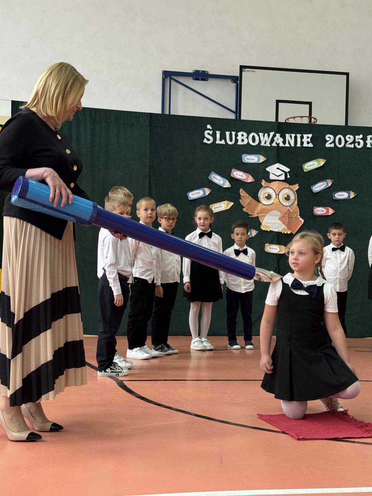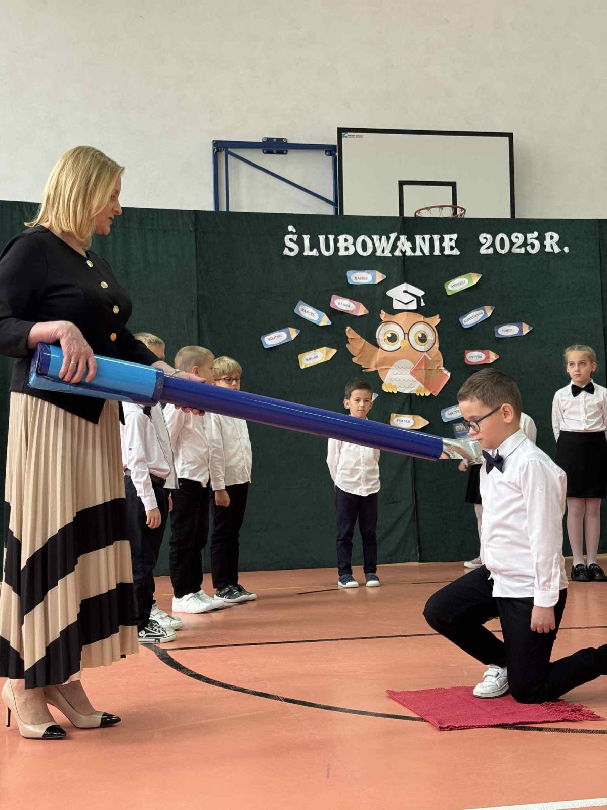 Podczas uroczystości uczniowie klasy pierwszej zostali przyjęci do grona uczniów. W trakcie akademii zaprezentowali swoje umiejętności, wyrecytowali wiersze i zaśpiewali piosenki. Przed pocztem sztandarowym ślubowali być dobrymi Polakami, godnie reprezentować swoją szkołę, swym zachowaniem i nauką sprawiać radość rodzicom i nauczycielom. Po złożeniu ślubowania pani dyrektor dokonała symbolicznego pasowania na ucznia. Po akademii dzieci udały się na „słodki” poczęstunek, przygotowany przez rodziców, którym serdecznie dziękujemy.