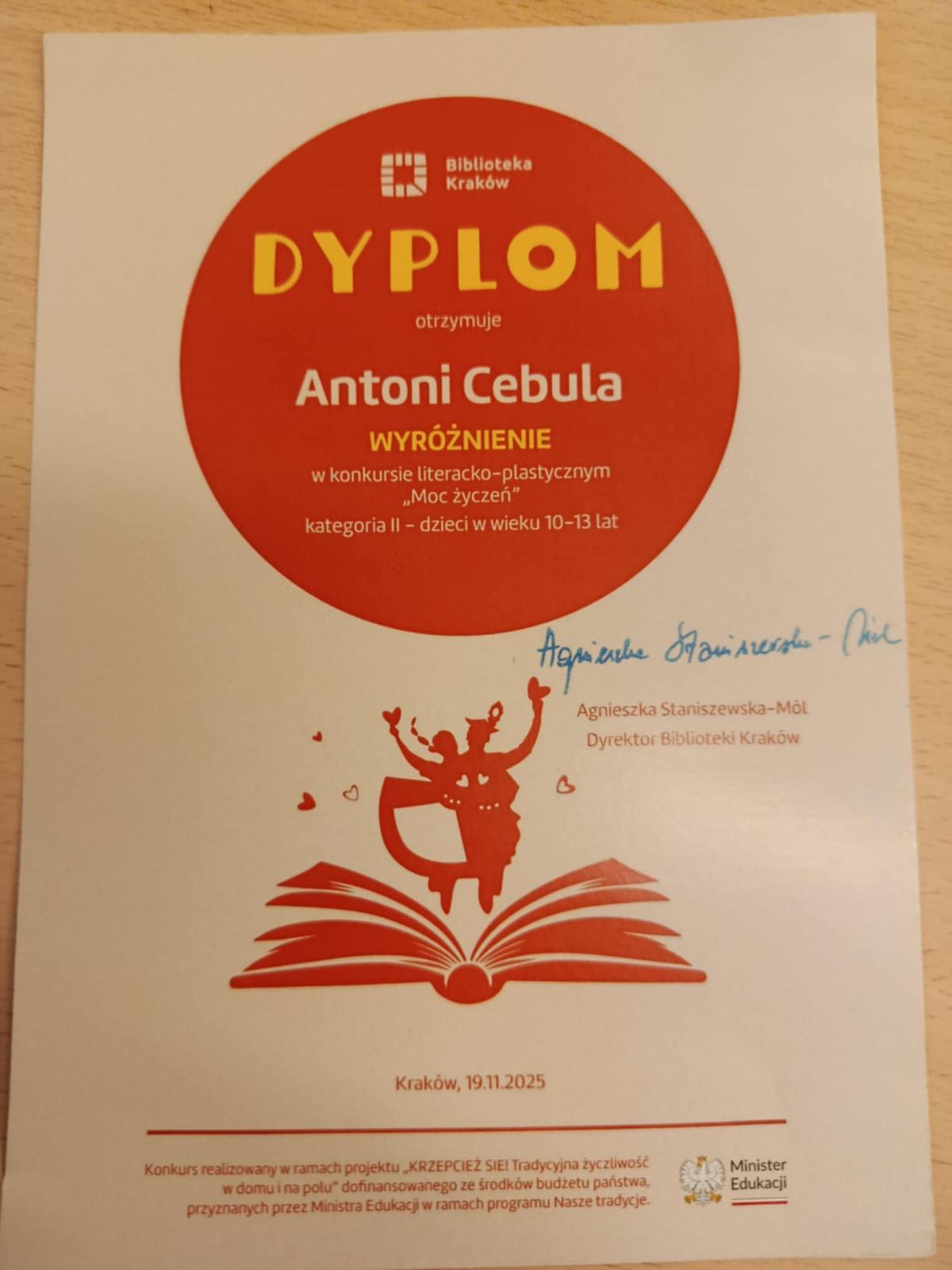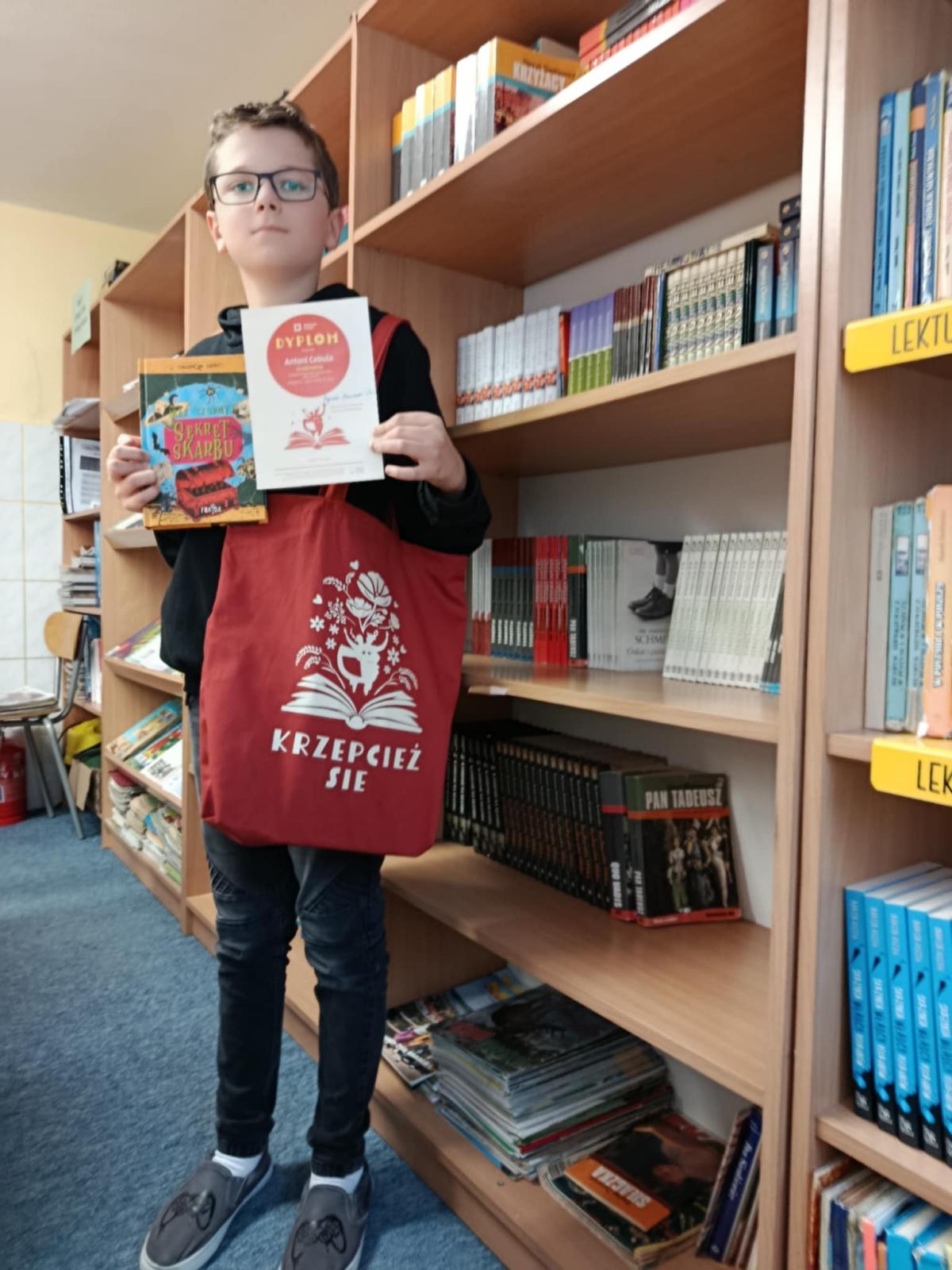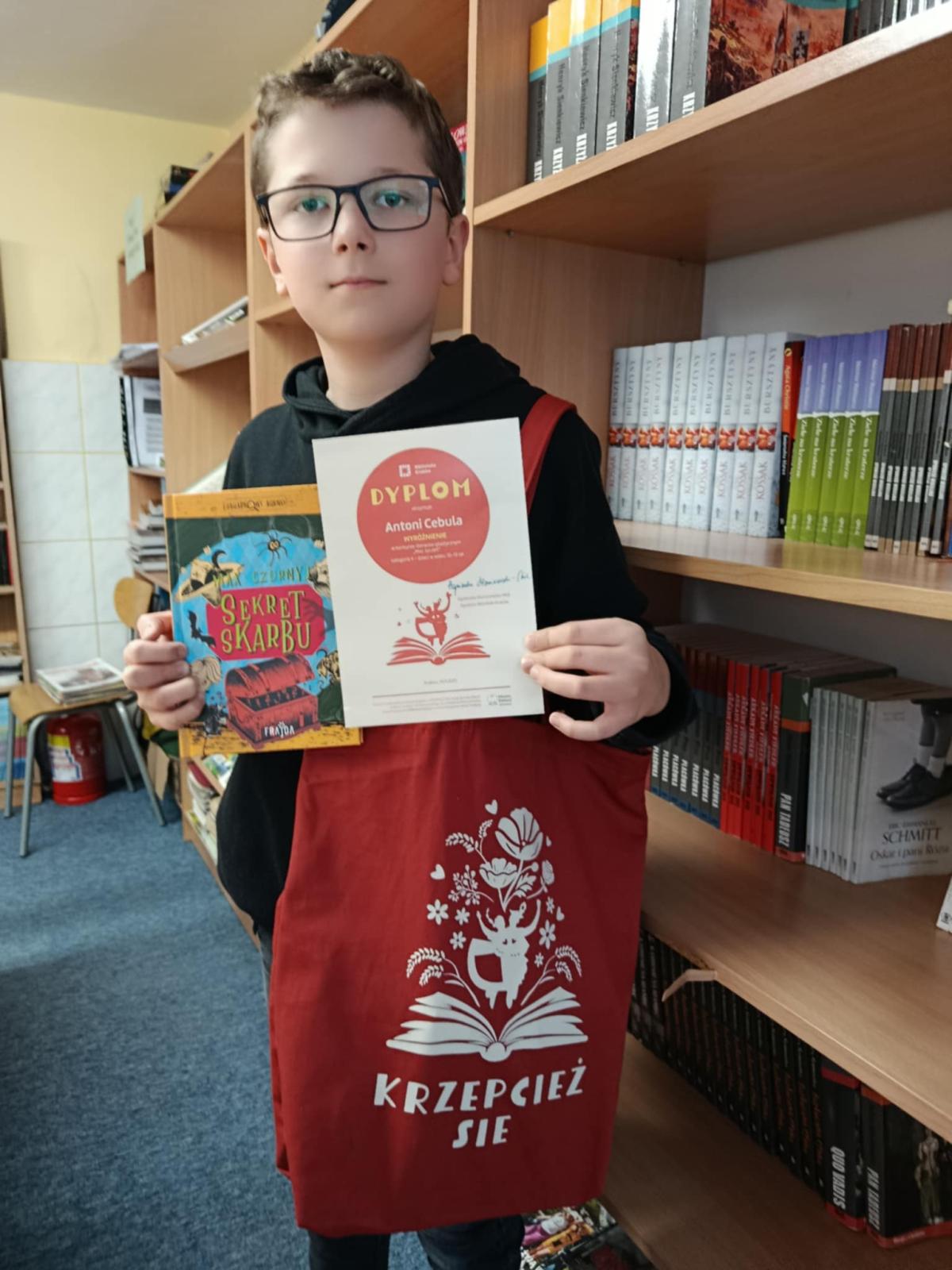 Na 174 prace nadesłane przez uczniów, Antoni Cebula zdobył wyróżnienie z czego bardzo się cieszymy i gratulujemy ogromnego talentu. Wraz z mamą odebrał nagrodę w Krakowie i miał okazję odwiedzić nie tylko Bibliotekę Kraków, ale również zwiedzić miasto.